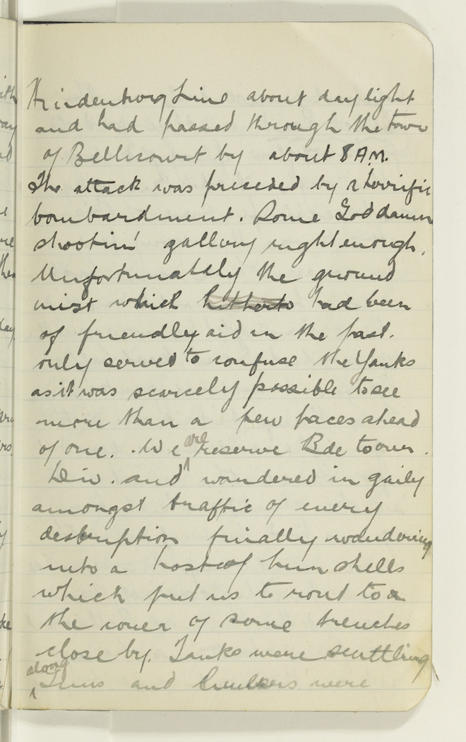 Hindenburg Line about day light and had passed through the town of Bellicourt by about 8 A.M. The attack was preceded by a horrific bombardment. Some God damn shootin' gallery right enough. Unfortunately the ground mist which hitherto had been of friendly aid in the past only served to confuse the Yanks as it was scarcely possible to see more than a few paces ahead of one. We are reserve Bde to our Div. and wandered in gaily amongst traffic of every description finally wandering into a host of hun shells which put us to rout to a the cover of some trenches close by. Tanks were scuttling along. Guns and limbers were