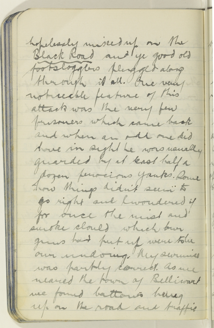 hopelessly mixed up on the Black Road and ye good old footsloggers plugged along through it all. One very noticeable feature of this attack was the very few prisoners which came back and when an odd one did hove in sight he was usually guarded by at least half a dozen ferocious Yanks. Some how things didn't seem to go right and I wondered if for once the mist and smoke clould which our guns had put up were to be our undoing. My surmise was partly correct. As we neared the town of Bellicourt we found batteries hung up on the road and traffic