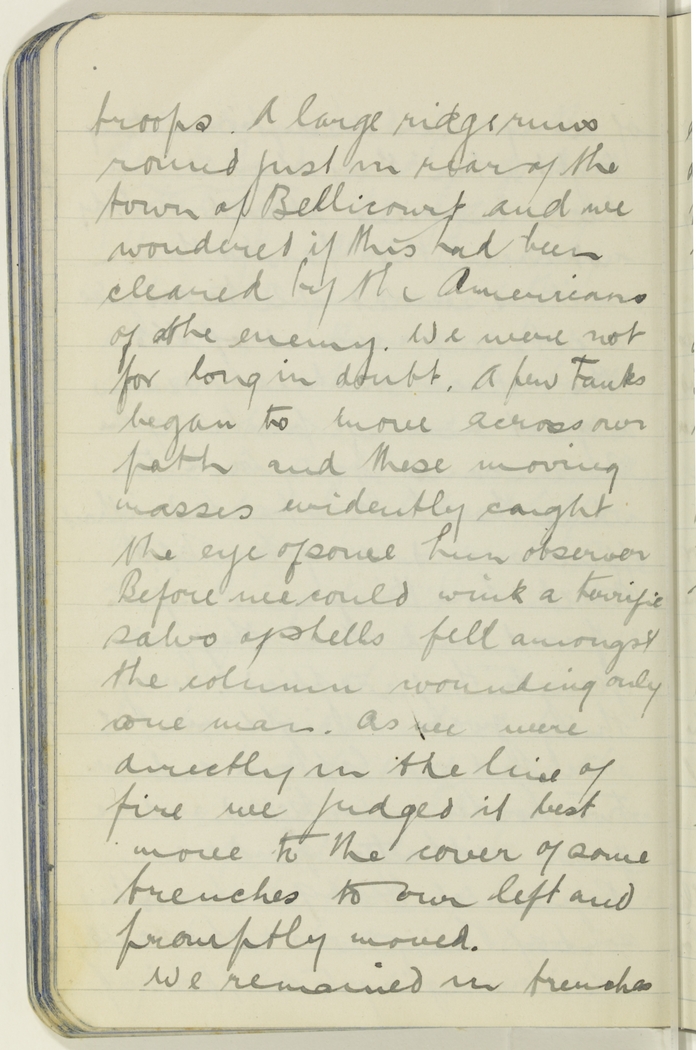 troops. A large ridge runs round just in rear of the town of Bellicourt and we wondered if this had been cleared by the Americans or the enemy. We were not for long in doubt. A few tanks began to move across our path and these moving masses evidently caught the eye of some hun observer Before we could wink a terrific salvo of shells fell amongst the column wounding only one man. As we were directly in the line of fire we judged it best move to the cover of some trenches to our left and promptly moved.