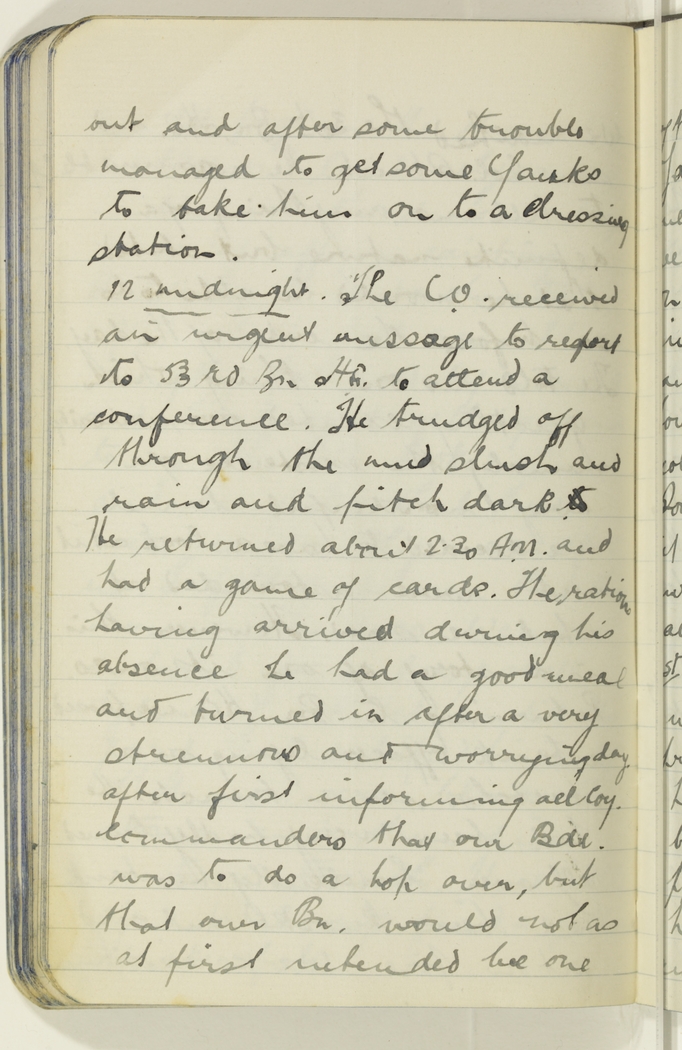 12 midnight The C.O. received an urgent message to report to 53rd Bn H.Q. to attend a conference. He trudged off through the mud slush and rain and pitch dark. to He returned about 2.30 A.M. and had a game of cards. The rations having arrived during his absence he had a good meal and turned in after a very strenuous and worrying day after first informing all Coy. Commanders that our Bde. was to do a hop over, but that our Bn. would not as at first intended be one