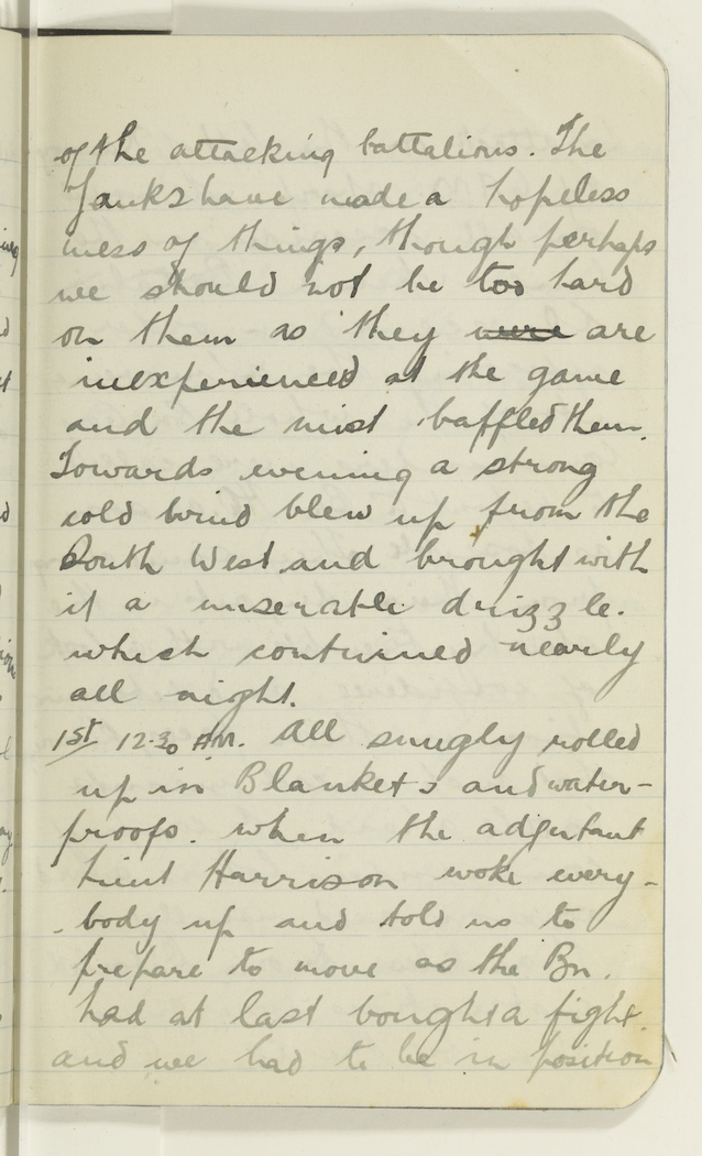 of the attacking battalions. The Yanks have made a hopeless mess of things, though perhaps we should not be too hard on them as they were are inexperienced at the game and the mist baffled them. Towards evening a strong cold wind blew up from the South West and brought with it a miserable drizzle which continued nearly all night.