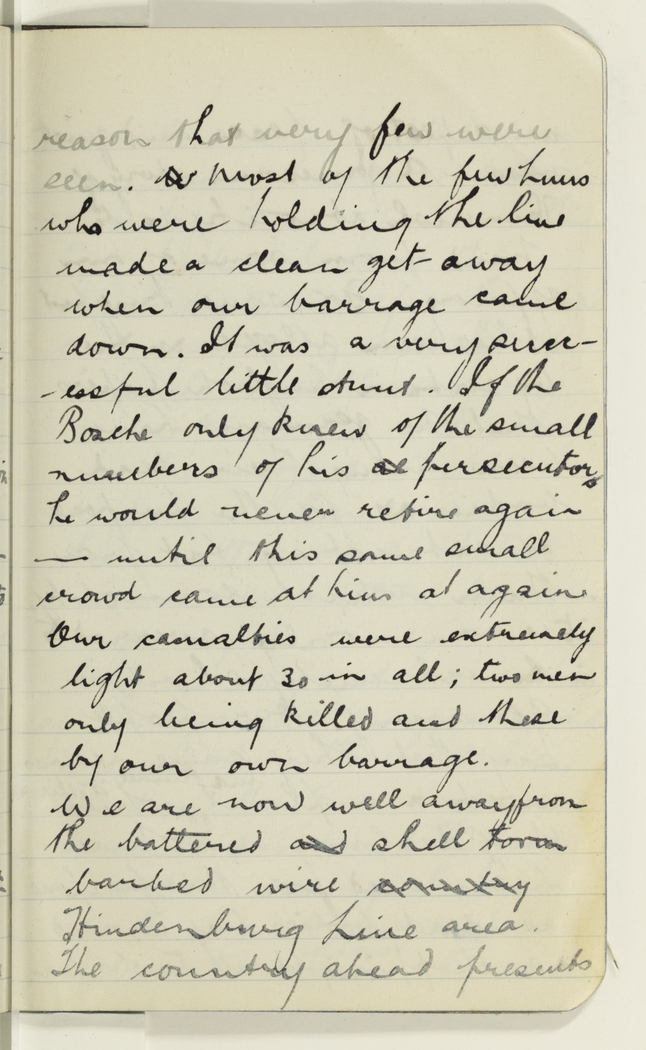reason that very few were seen. W Most of the few huns who were holding the line made a clean get-away when our barrage came down. It was a very successful little stunt. If the Bosche only knew of the small numbers of his at persecutors he would never retire again – until this same small crowd came at him at again. Our casualties were extremely light about 30 in all; two men only being killed and these by our own barrage.