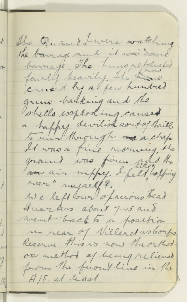 The C.O. and I were watching the barrage and it was some barrage. The huns retaliated fairly heavily. The huns row caused by a few hundred guns barking and the shells exploding caused a happy devilish sort of thrill to run through one a chap It was a fine morning, the ground was firm and the ar air nippy. I felt like "hopping over" myself?