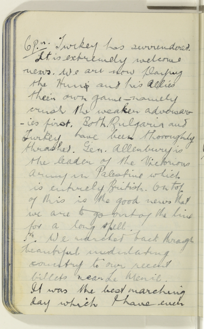 6 p.m. Turkey has surrendered. It is extremely welcome news. We are now playing the Hun s and his Allies their own game – namely crush the weaker adversaries first. Both Bulgaria and Turkey have been thoroughly thrashed. Gen. Allenbury is the leader of the Victorious Army in Palestine which is entirely British. On top of this is the good news that we are to go out of the line for a long spell.