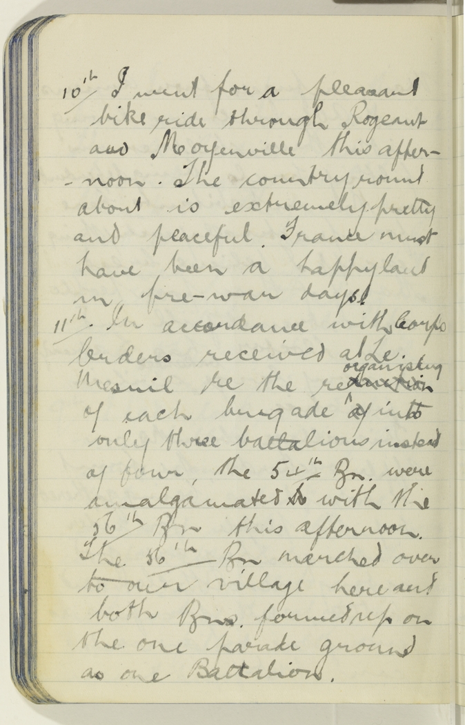 In accordance with Corps Orders received at Le Mesnil re the re direction organising of each brigade of into only three battalions instead of four, the 54th Bn. were amalgamated to with the 56th Bn this afternoon. The 56th Bn. marched over to our village here and both Bns. formed up on the one parade ground as one Battalion.