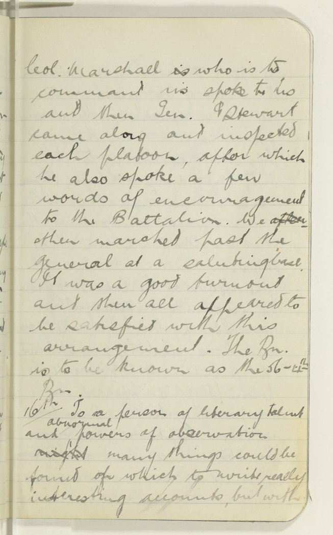 Col. Marshall is who is to command us spoke to us and then Gen. G Stewart came along and inspected each platoon, after which he also spoke a few words of encouragement to the Battalion. We after then marched past the General at a salutingbase. It was a good turnout and then all appeared to be satisfied with this arrangement. The Bn. is to be known as the 56-4th Bn.
