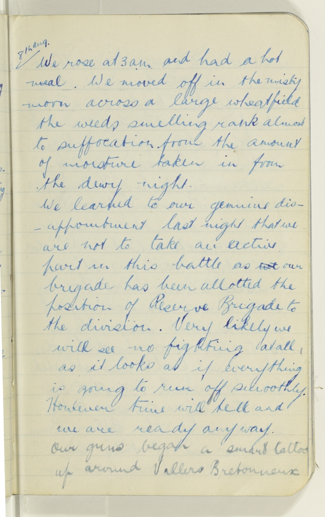 We learned to our genuine disappointment last night that we are not to take an active part in this battle as we our brigade has been allotted the position of Reserve Brigade to the division. Very likely we will see no fighting at all as it looks as if everything is going to run off smoothly. However time will tell and we are ready anyway. Our guns began a smart tattoo up around Villers Bretonneux
