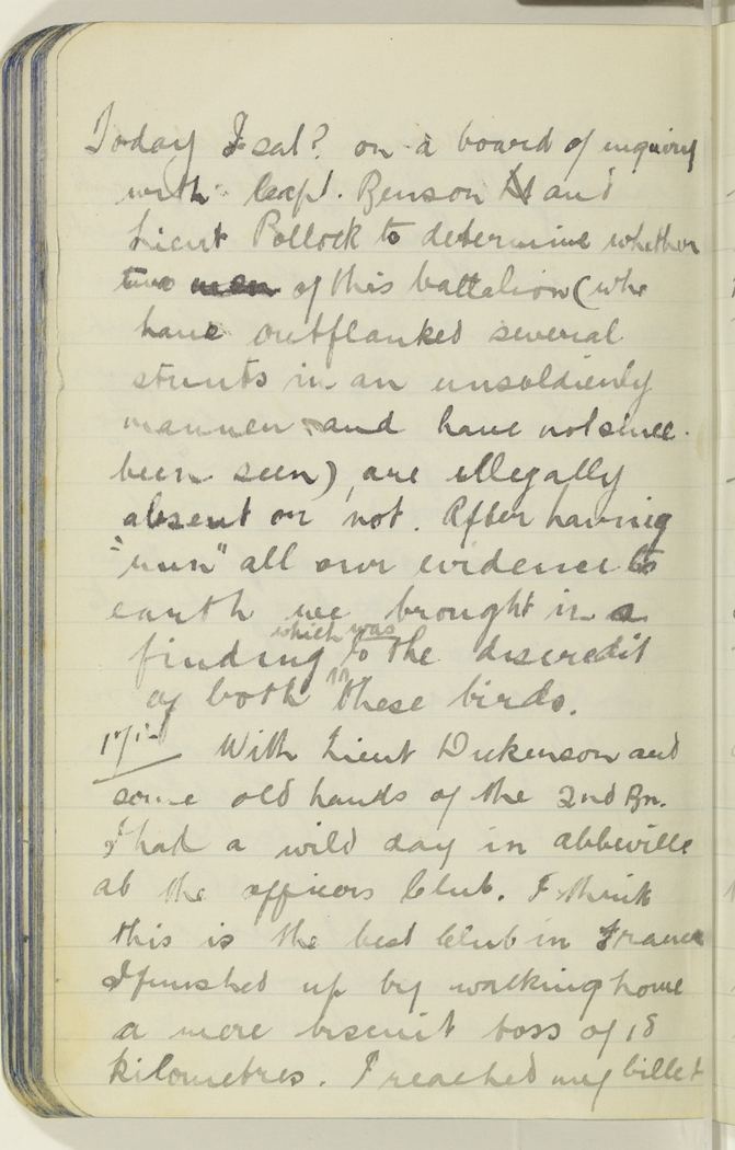 Today I sat ? on a board of enquiry with Capt. Benson Lt and Lieut Pollock to determine whether two men of this battalion (who have outflanked several stunts in an unsoldierly manner and have not since been seen) are illegally absent or not. After having "run" all our evidence to earth we brought in a finding which was to the discredit of both these birds.