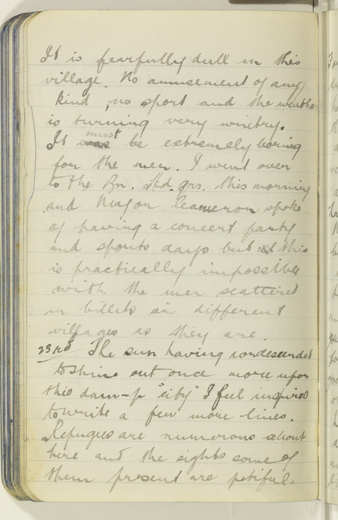 It is fearfully dull in this village. No amusement of any kind, no sport and the weather is turning very wintry. It was must be extremely boring for the men. I went over to the Bn. Hd.qrs. this morning and Major Cameron spoke of having a concert party and sports days but at this is practically impossible with the men scattered in billets in different villages as they are.