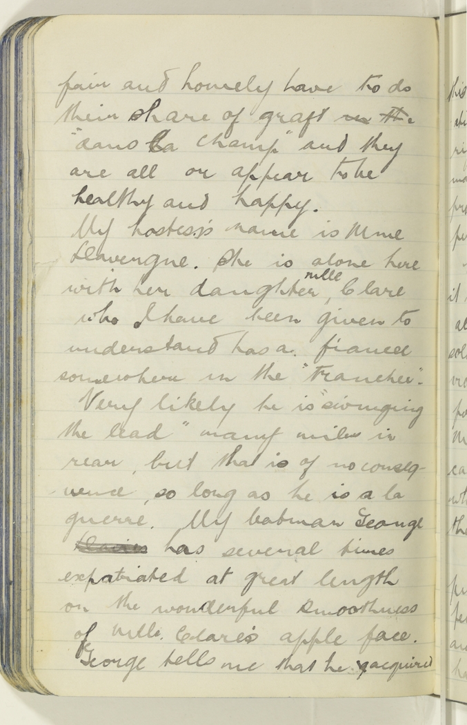 My hostess's name is Mme Davergne. She is alone here with her daughter Mlle Clare who I have been given to understand has a fiancée somewhere in the "tranchee". Very likely he is "swinging the lead" many miles in rear, but that is of no consequence, so long as he is a la guerre. My batman George Davies has several times expatiated at great length on the wonderful smoothness of Mlle Clare's apple face. George tells me that he g acquired