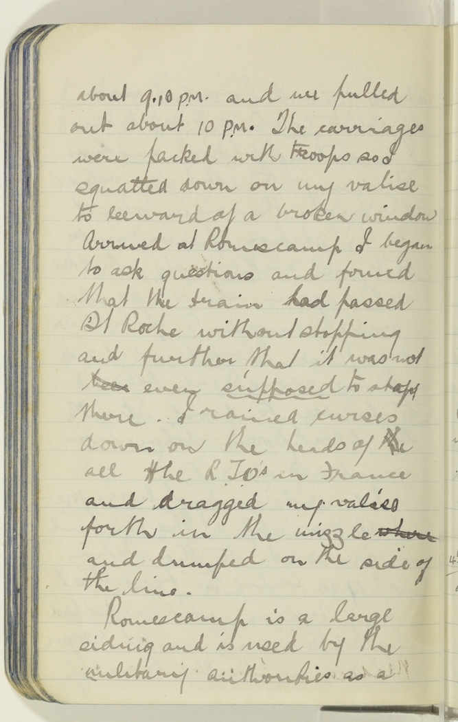 about 9.10 p.m. and we pulled out about 10 p.m. The carriages were packed with troops so I squatted down on my valise to leeward of a broken window. Arrived at Romescamp I began to ask questions and found that the train had passed St. Roche without stopping and further, that it was not been even supposed to stop there. I rained curses down on the heads of the all the R.T.O's in France and dragged my valise forth in the mizzle where and dumped on the side of the line.