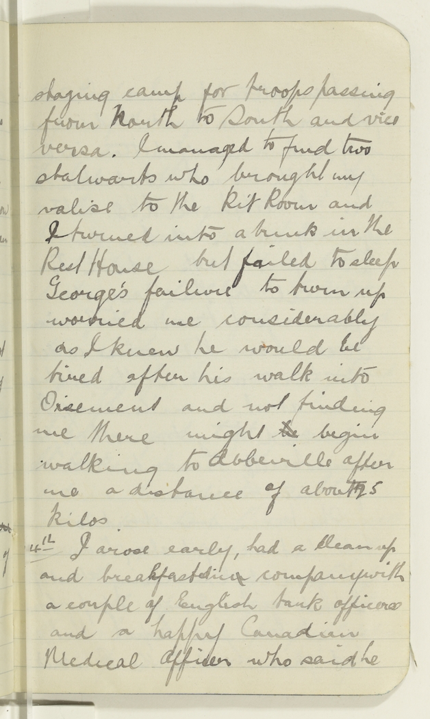 staging camp for troops passing from North to South and vice versa. I managed to find two stalwarts who brought my valise to the Kit Room and I turned into a bunk in the Rest House but failed to sleep. George's failure to turn up worried me considerably as I knew he would be tired after his walk into Oisement and not finding me there might be begin walking to Abbeville after me a distance of about 25 kilos.