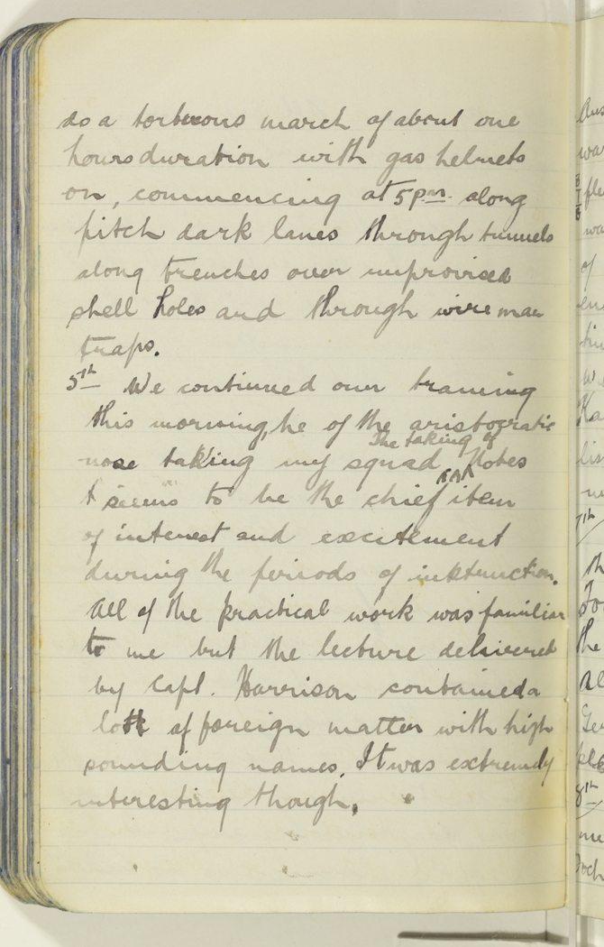 We continued our training this morning, he of the aristocratic nose taking my squad. The taking of notes seems to be the chief item of interest and excitement during the periods of instruction. All of the practical work was familiar to me but the lecture delivered by Capt. Harrison contained a lot e of foreign matter with high sounding names. It was extremely interesting though.
