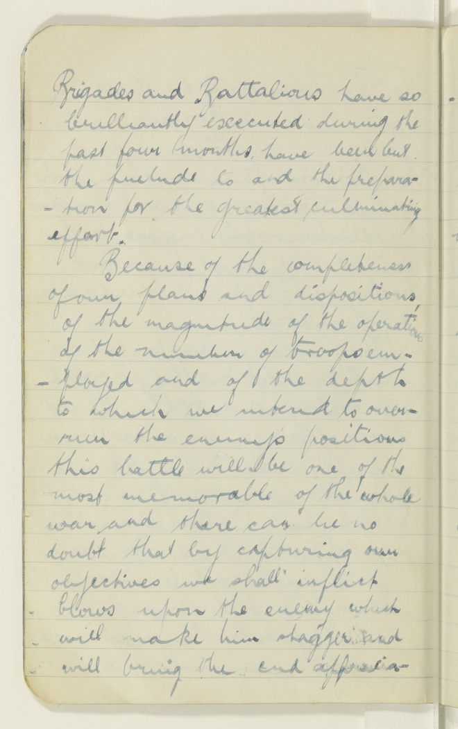 Because of the completeness of our plans and dispositions, of the magnitude of the operation, of the number of troops employed and of the depth to which we intend to over-run the enemy's positions this battle will be one of the most memorable of the whole war and there can be no doubt that by capturing our objectives we shall inflict blows upon the enemy which will make him stagger and will bring the end apprecia-