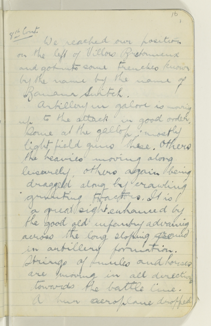 Artillery in galore is moving up to the attack in good order. Some at the gallop, mostly light field guns these. Others the heavies moving along leisurely, others again being dragged along by crawling grunting tractors. It is a great sight enhanced by the good old infantry advancing across the long sloping ground in artillery formation. Strings of mules and horses are moving in all directions towards the battle line. A hun aeroplane dropped