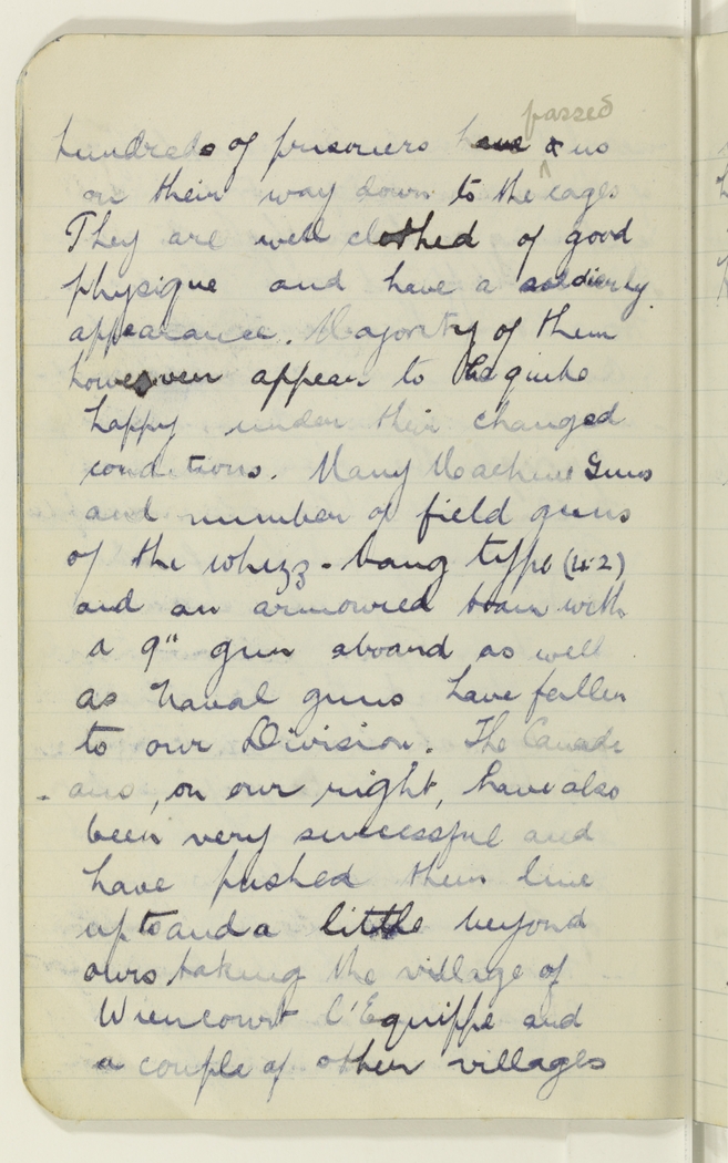 hundreds of prisoners have passed c us on their way down to the cages. They are well clothed of good physique and have a soldierly appearance. Majority of them however appear to be quite happy under their changed conditions. Many Machine Guns and number of field guns of the whiz-bang type (4.2) and an armoured train with a 9" gun aboard as well as naval guns have fallen to our Division. The Canadians, on our right, have also been very successful and have pushed their line up to and a little beyond ours taking the village of Wiencourt l'Equippe and a couple of other villages