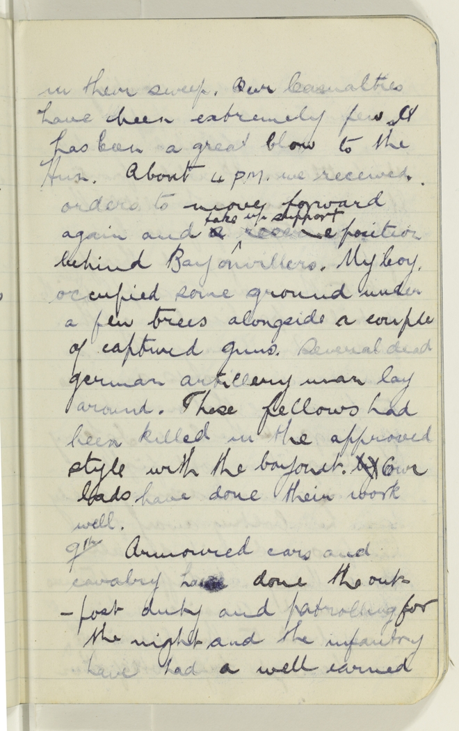 in their sweep. Our Casualties have been extremely few. It has been a great blow to the Hun. About 4 p.m. we received orders to move forward again and a take up support rescue position behind Bayonvillers. My Coy. occupied some ground under a few trees alongside a couple of captured guns. Several dead german artillery men lay around. These fellows had been killed in the approved style with the bayonet. by Our lads have done their work well.