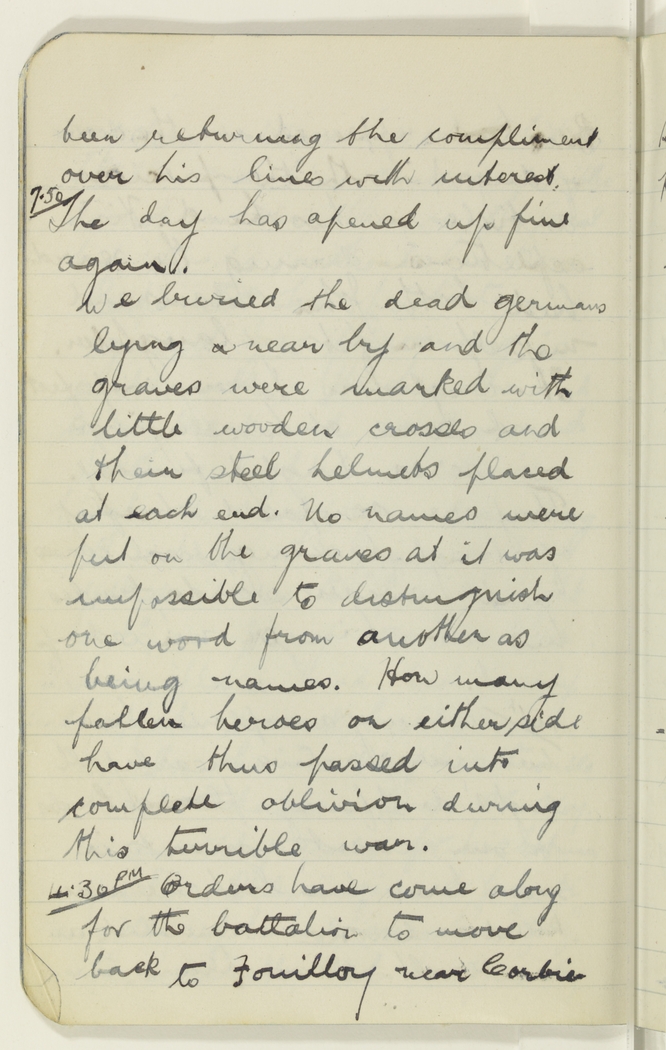 We buried the dead germans lying a near by and the graves were marked with little wooden crosses and their steel helmets placed at each end. No names were put on the graves as it was impossible to distinguish one word from another as being names. How many fallen heroes on either side have thus passed into complete oblivion during this terrible war.