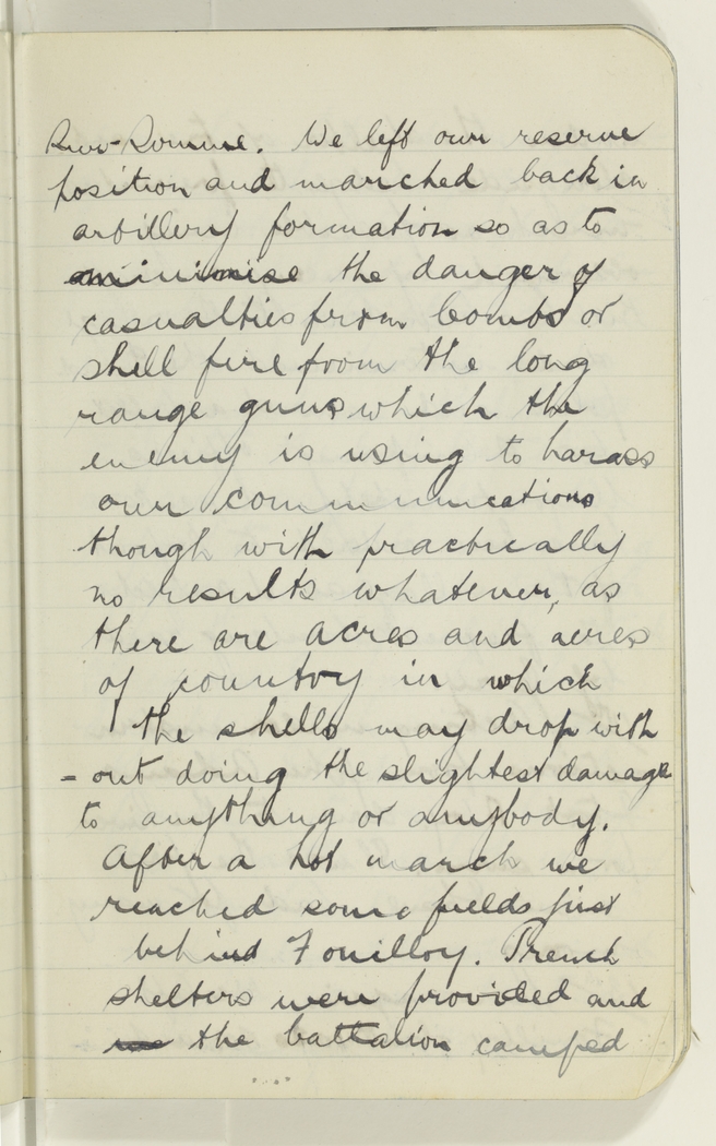 Sur-Somme. We left our reserve position and marched back in artillery formation so as to minimise the danger of casualties from bombs or shell fire from the long range guns which the enemy is using to harass our communications though with practically no results whatever, as there are acres and acres of country in which the shells may drop without doing the slightest damage to anything or anybody. After a hot march we reached some fields just behind Fouilloy. French shelters were provided and we the battalion camped