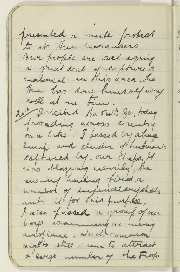 I visited the 54th Bn. today proceeding across country on a bike. I passed by a huge dump and cluster of hutments captured by our chaps. It was blazing merrily, the enemy having fired a number of incendiary shells into it for this purpose. I also passed a group of our boys examining an enemy aeroplane. Such common sights still seem to attract a large number of the troops.