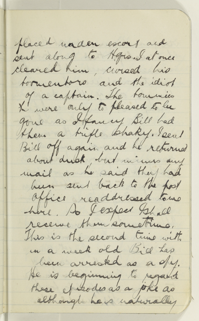 placed under escort and sent along to Hqrs. I at once cleared him, cursed his tormentors and the idiot of a captain. The tommies h were only to pleased to be gone as I fancy Bill had them a trifle shaky. I sent Bill off again and he returned about dusk, but minus my mail as he said they had been sent back to the post office readdressed to me here. So I expect I shall receive them sometime. This is the second time with in a week old Bill has been arrested as a spy. He is beginning to regard these episodes as a joke as although he is naturally