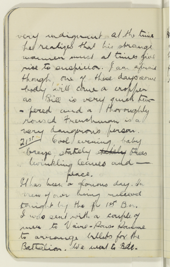 very indignant at the time he realizes that his strange manner must at times give rise to suspicion. I am afraid though, one of these days some body will come a cropper as Bill is very quick tempered and a thoroughly roused Frenchman is a very dangerous person.
