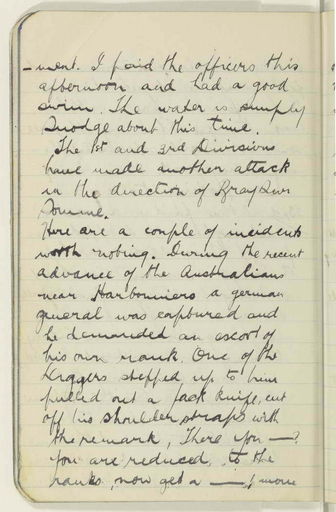 Here are a couple of incidents worth noting. During the recent advance of the Australians near Harbonniers a german general was captured and he demanded an escort of his own rank. One of the Diggers stepped up to him pulled out a pack knife, cut off his shoulder straps with the remarks, There you --? You are reduced to the ranks, now get a --! move