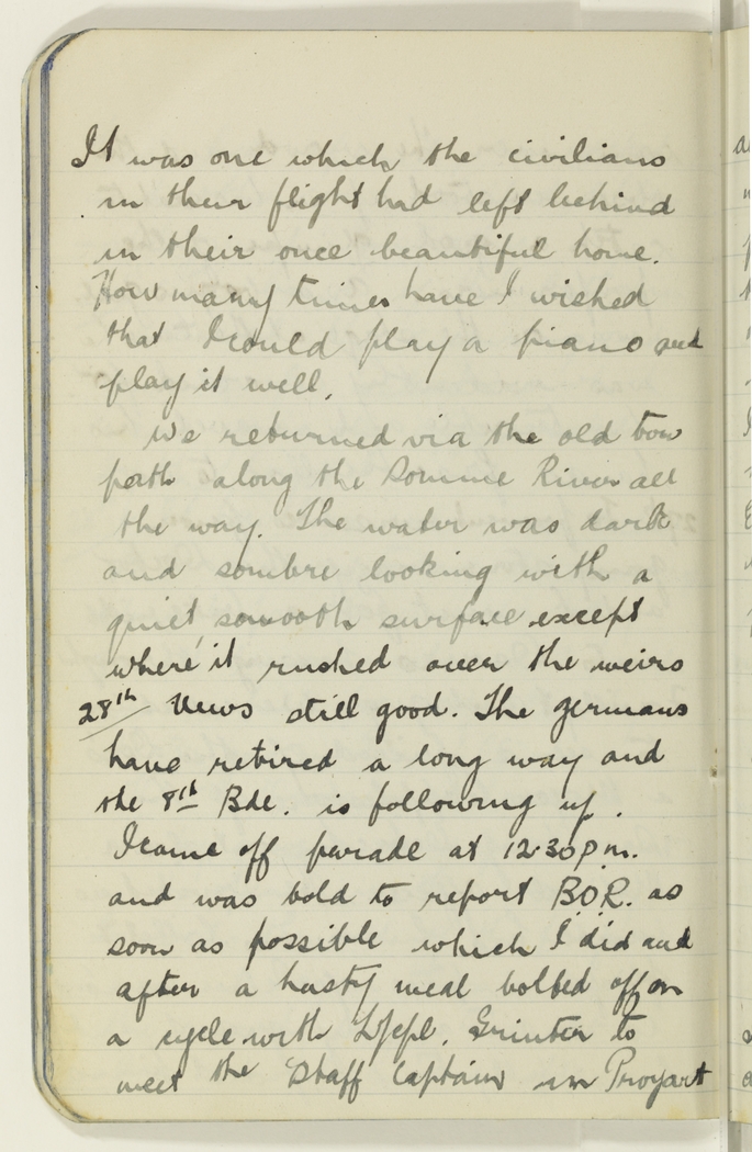 News still good. The germans have retired a long way and the 8th Bde. is following up. I came off parade at 12.30 p.m. and was told to report B.O.R. as soon as possible which I did and after a hasty meal bolted off on a cycle with L/cpl. Grinter to meet the Staff Captain in Proyart