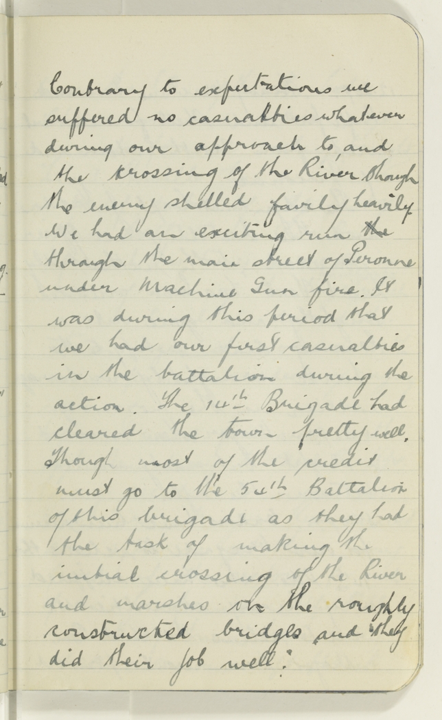 Contrary to expectations we suffered no casualties whatever during our approach to, and the crossing of the River though the enemy shelled fairly heavily. We had an exciting run the through the main street of Peronne under Machine Gun fire. It was during this period that we had our first casualties in the battalion during the action. The 14th Brigade had cleared the town pretty well. Though most of the credit must go to the 54th Battalion of this brigade as they had the task of making the initial crossing of the River and marshes on the roughly constructed bridges and they did their job well.