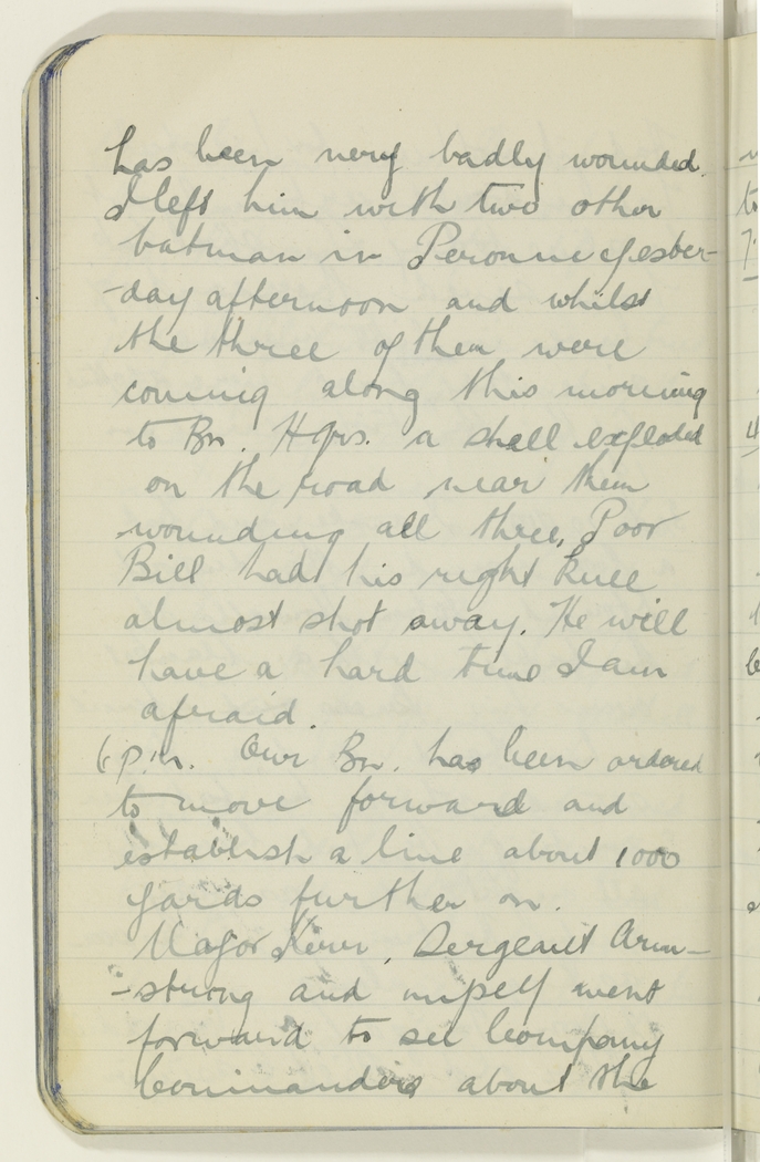 has been very badly wounded. I left him with two other batmen in Peronne yesterday afternoon and whilst the three of them were coming along this morning to Bn. Hqrs. a shell exploded on the road near them wounding all three. Poor Bill had his right knee almost shot away. He will have a hard time I am afraid.