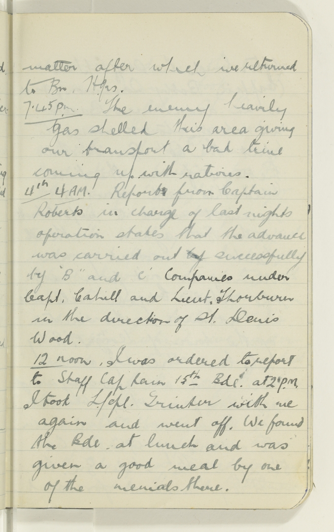 4 AM. Reports from Captain Roberts in charge of last nights operation states that the advance was carried out by successfully by "B" and "C" Companies under Capt. Cahill and Lieut. Thorburn in the direction of St. Denis Wood.