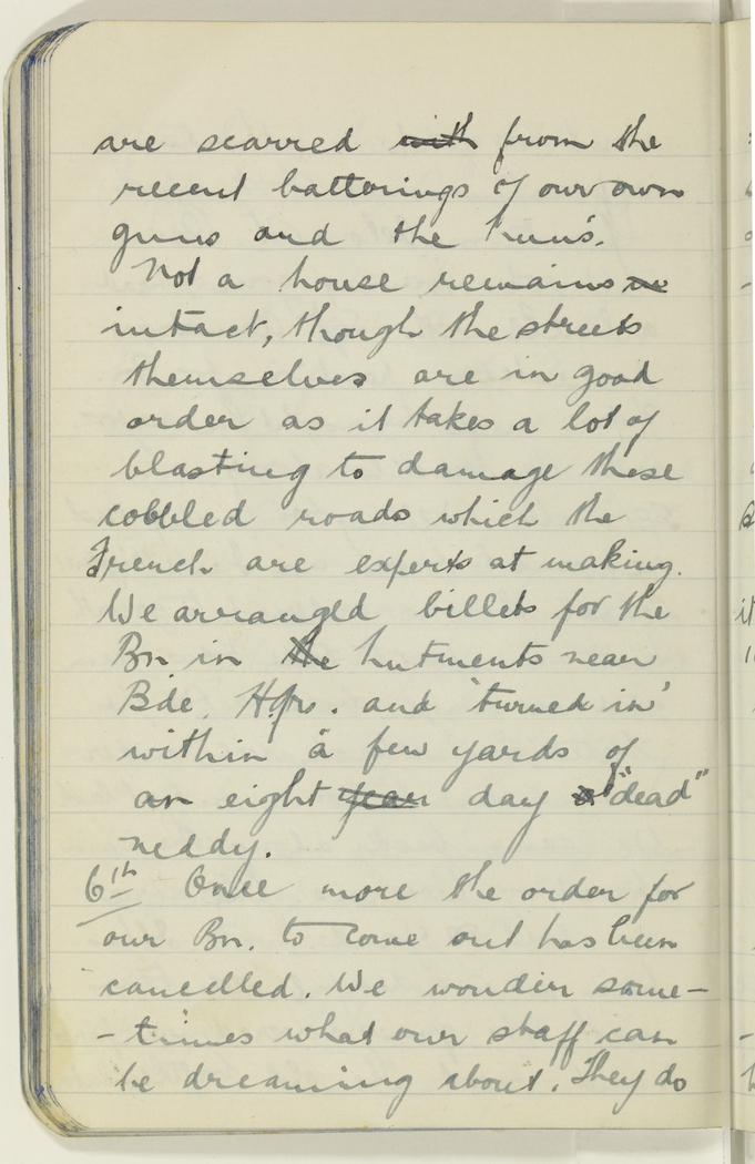 are scarred with from the recent batterings of our own guns and the hun's. Not a house remains un intact, though the streets themselves are in good order as it takes a lot of blasting to damage these cobbled roads which the French are experts at making. We arranged billets for the Bn. in the hutments near Bde. Hqrs. and "turned in" within a few yards of an eight year day a "dead" neddy.