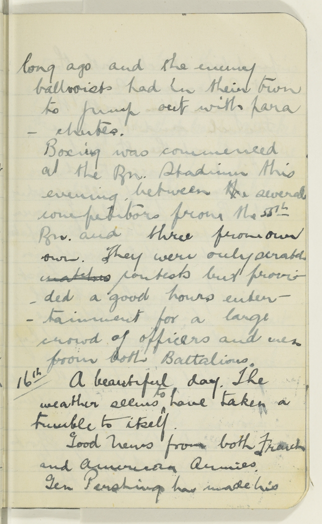 Boxing was commenced at the Bn. Stadium this evening between the several competitors from the 55th Bn. and three from our own. They were only scratch matches contests but provided a good hours entertainment for a large crowd of officers and men from both Battalions.