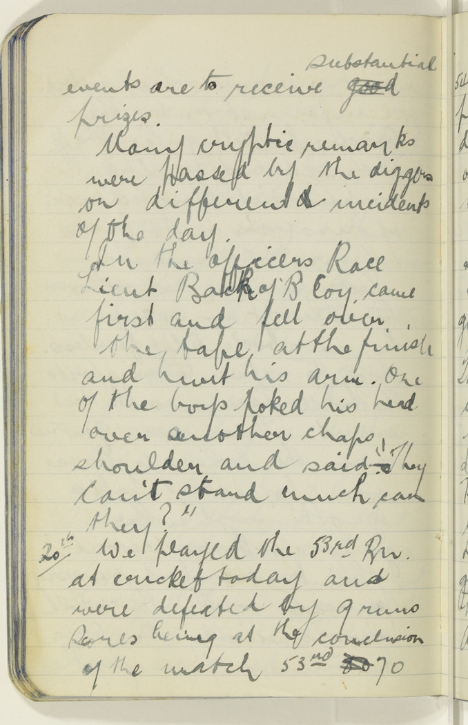 In the officers Race Lieut. Bach of 'B' Coy. came first and fell over the tape at the finish and hurt his arm. One of the boys poked his head over another chaps shoulder and said "They can't stand much can they?"