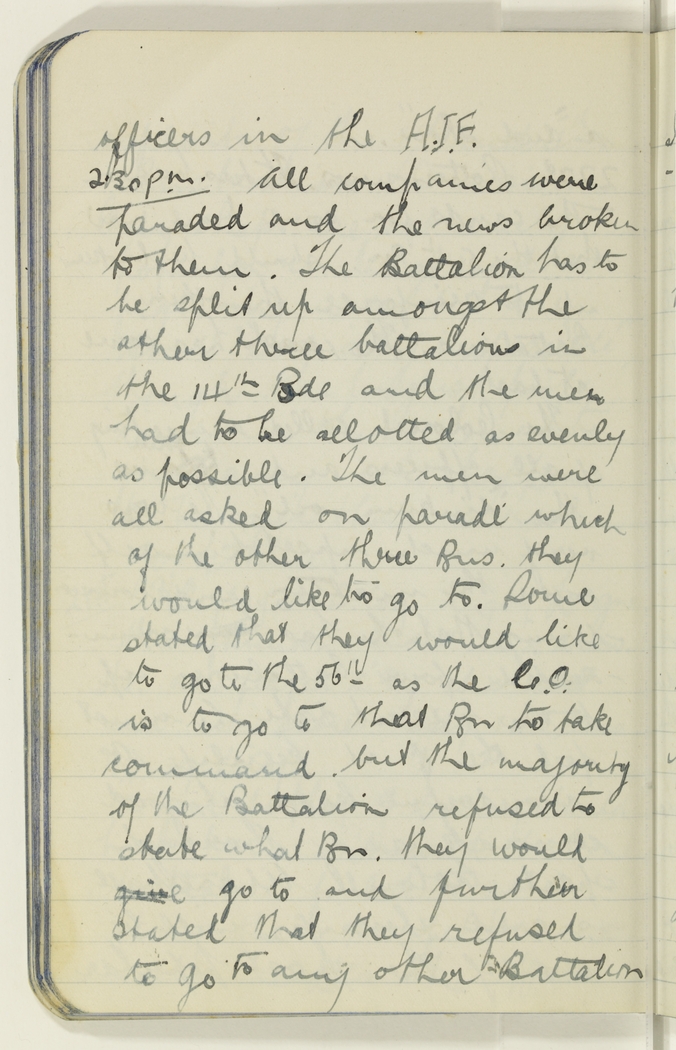 2.30 p.m. All companies were paraded and the news broken to them. The Battalion has to be split up amongst the other three battalions in the 14th Bde. and the men had to be allotted as evenly as possible. The men were all asked on parade which of the other three Bns. they would like to go to. Some stated that they would like to go to the 56th as the C.O. is to go to that Bn to take command, but the majority of the Battalion refused to state what Bn. they would give go to and further stated that they refused to go to any other Battalion.