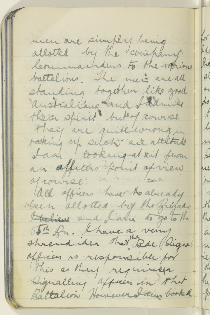 men are simply being allotted by the company Commanders to the various battalions. The men are all standing together like good Australians and I admire their spirit but of course they are quite wrong in taking up such an attitude I am looking at it from an officers point of view of course.