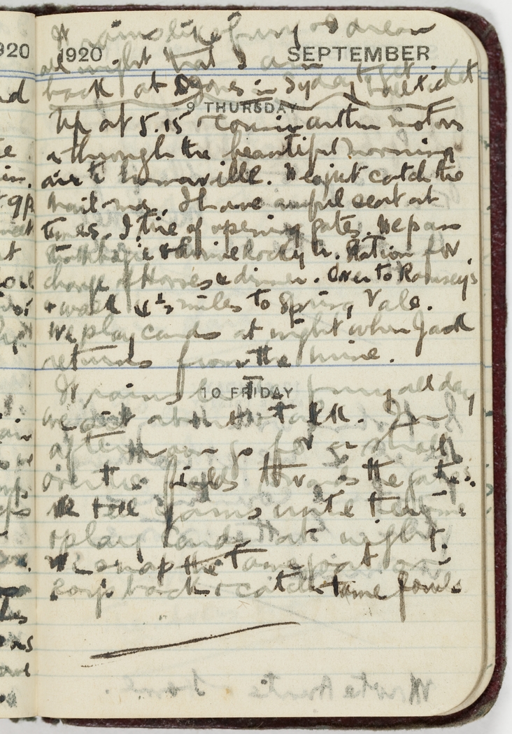 Up at 5.15 and Connie Arthurs motors through the beautiful morning air to [Ermanville.] We just catch the mail bus. I have awful seat at times. I tire of opening gates. We pass [Strathboyne] & arrive Rocky Cr. station for change of Horses & dinner. Over to Ramsey's & walk 4½ miles to Spring Vale. We play cards at night when Jack returns from the mine.