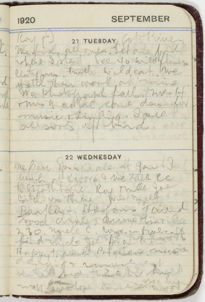 Roy and I go to River. We fish all over. Get one fish where I stand see 40 wild flowers Platypus, Turtle wild cat. We watch them work at mine. We photograph falls. Mrs H & Mrs Mackie come down for music and singing. I see all sorts of birds.