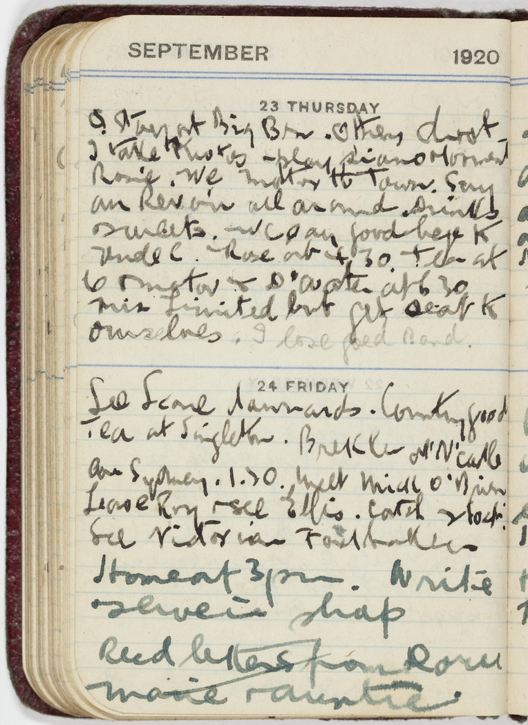 I stay at Big Brn. Others dont. I take photos - play piano & torment Rose. We motor to town. Say au Revoir all around. Drinks & sweets. We say good bye to uncle C. Rose at 4.30. Tea at 6 & motor to D'water at 6.30 miss Limited but get seat to ourselves. I lose gold Band.