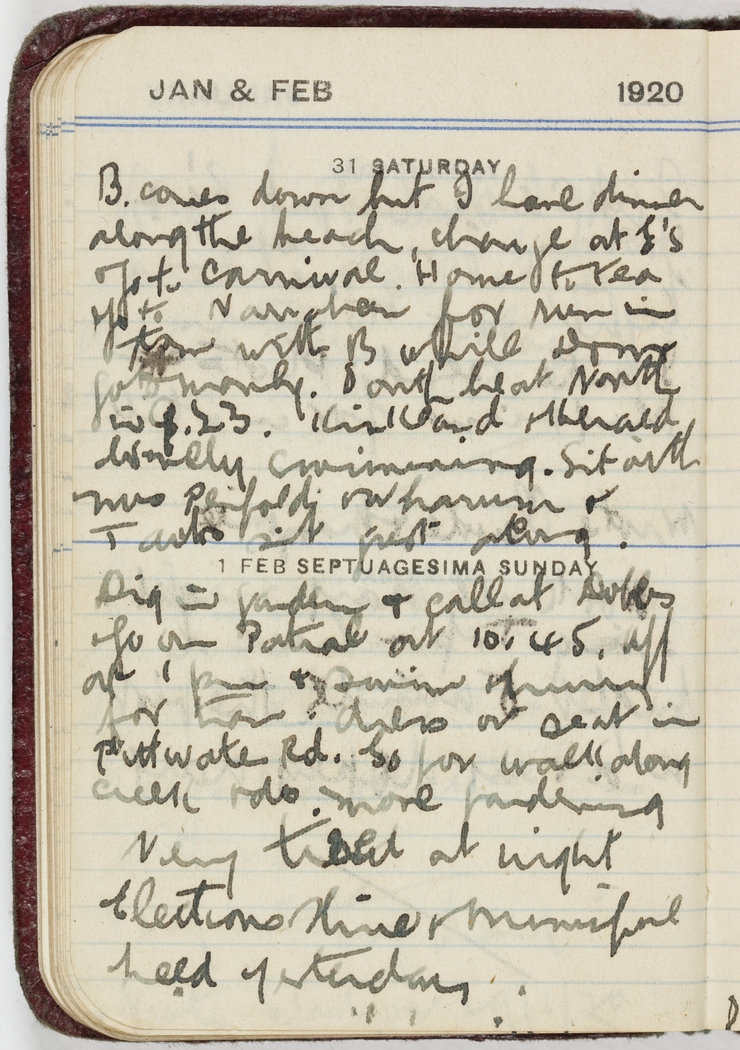 B comes down but I have dinner along the beach, change at E's & go to Carnival. Home to tea. Go to Narrabeen for run in town with B while D & m go to Manly. South beat North in 9.23. Kirkland and Herald do relay swimming. Sit with Mrs Penfold and Larman & Taubs sit just along.