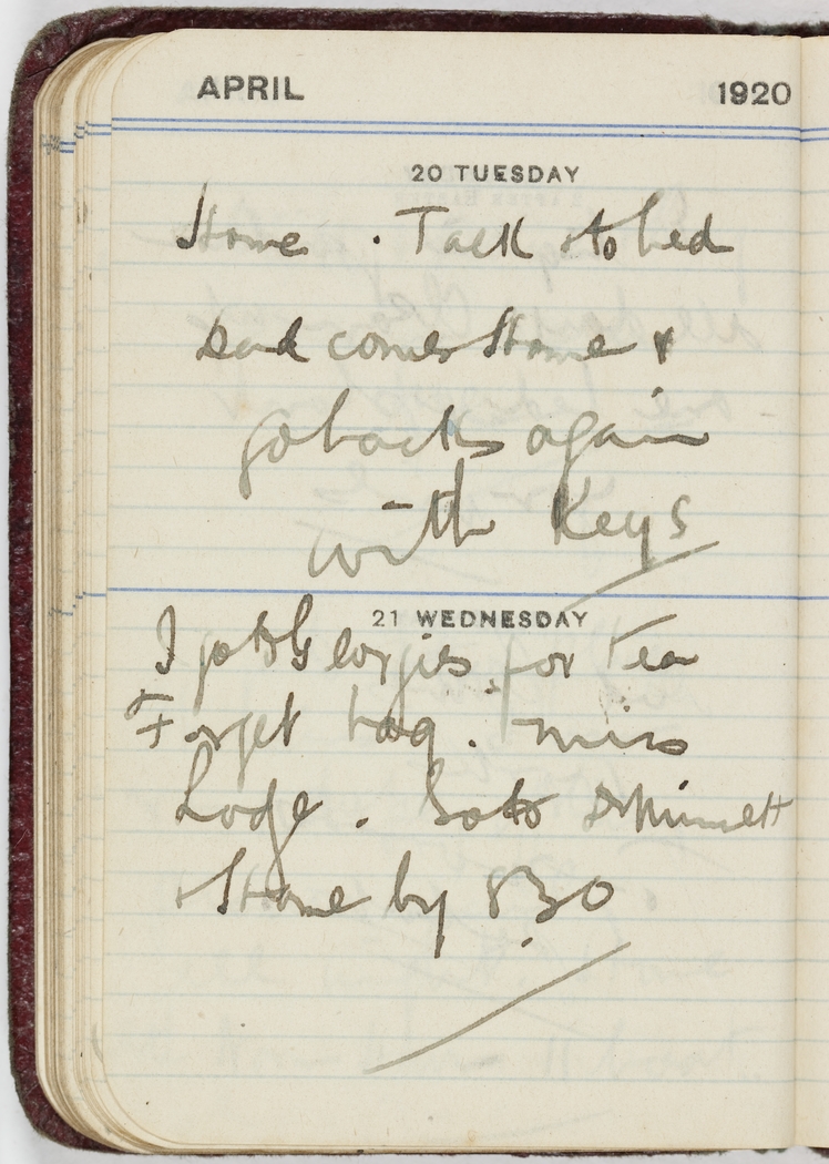 I go to George's for tea Forget bag. Miss Lodge. Go to Dr Minnett & Home by 8.30