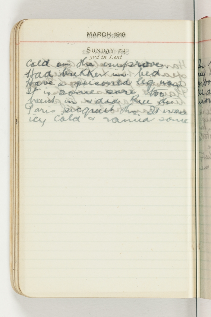 Cold on the improve. Had brekker in bed. Have a poisoned leg now. It is some sore too. Went in & did Rue de Paris picquet tho. It was icy cold & rained some.
