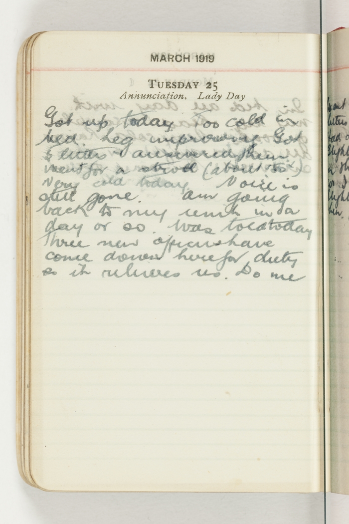 Got up today. Too cold in bed. Leg improving. Got 5 letters & answered them. Went for a stroll (about 150). Very cold today. Voice is still gone. Am going back to my unit in a day or so. Was told today Three new officers have come down here for duty so it relieves us. Do me.
