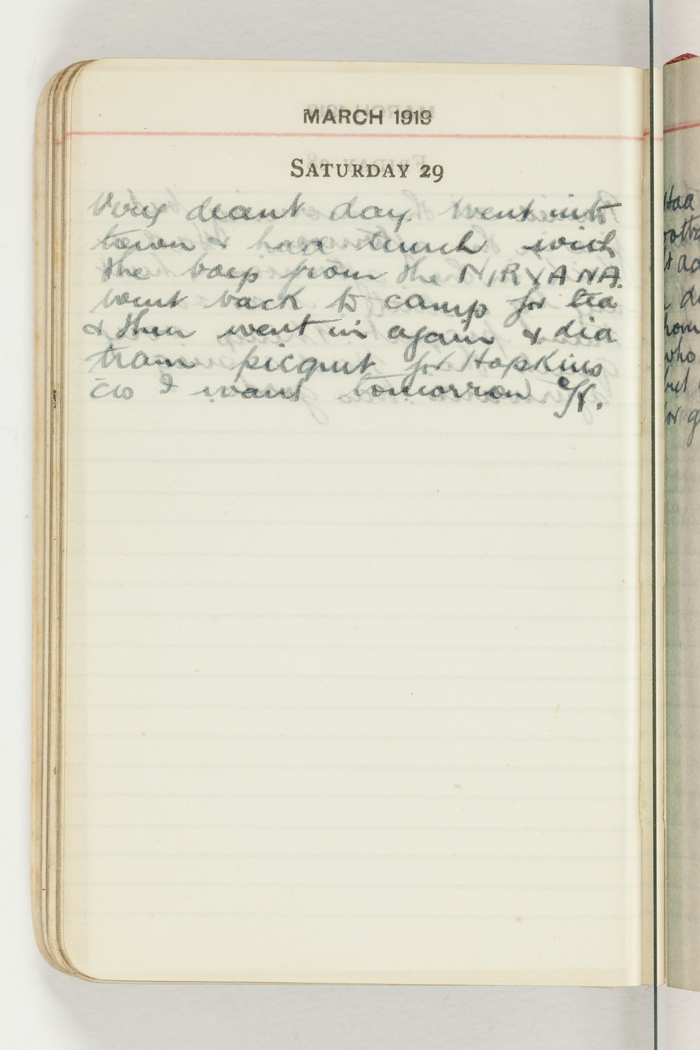 Very decent day. Went into town & had lunch with the boys from the Nirvana. Went back to camp for tea & then went in again & did train picquet for Hopkins cos I want tomorrow off.