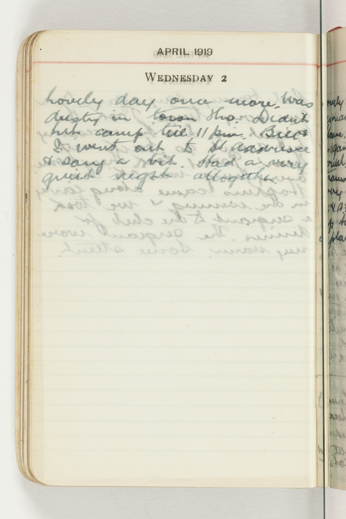 Lovely day once more. Was dusty in town tho. didn't hit camp till 11 pm. Bill & I went out to St.Addresse [Adresse] & sang a bit. Had a very quiet night altogether.