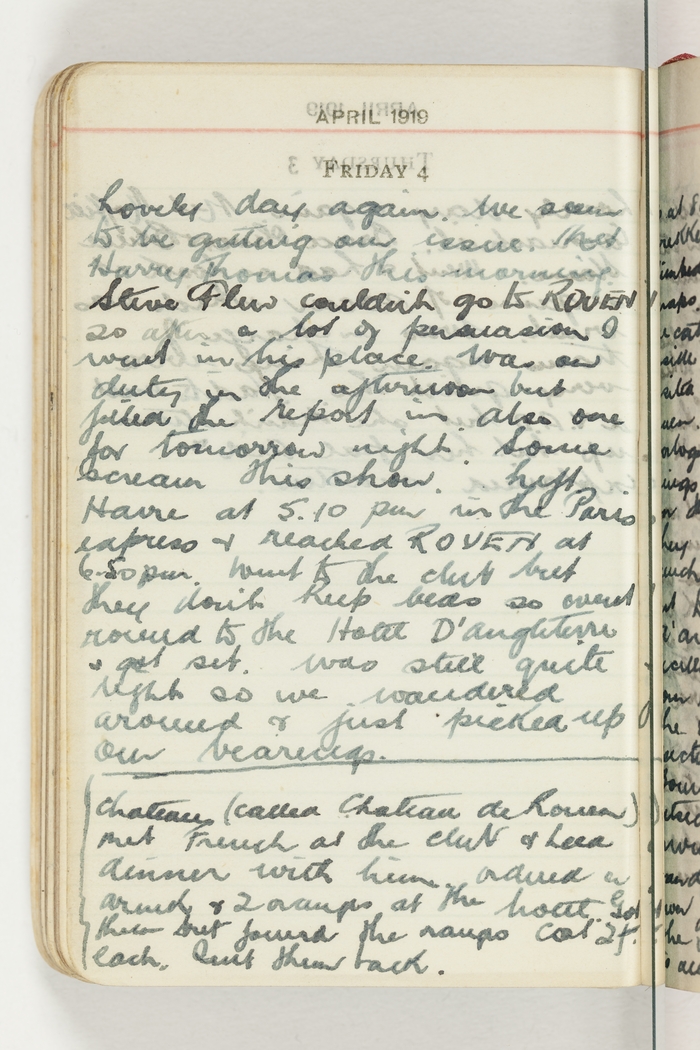 Lovely day again. We seem to be getting our issue. Met Harry Thomas this morning. Steve Flew couldn't go to Rouen so after a lot of persuasion I went in his place. Was on duty in the afternoon but filled the report in. Also one for tomorrow night. Some scream this show. Left Havre at 5.10 pm in the Paris express & reached Rouen at 6.50 pm. Went to the club but they didn't keep beds so went around to the Hotel D'Angliterre & got set. Was still quite light so we wandered around & just picked up our bearings