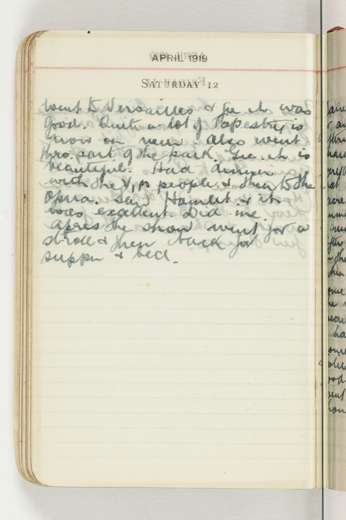 Went to Versailles & gee it was good. Quite a lot of tapestry is now on view. Also went thro. part of the park. Gee it is beautiful. Had dinner with the Y, M people & then to the opera. Saw Hamlet & it was excellent. Did me. Apres the show went for a stroll & then back for supper & bed.