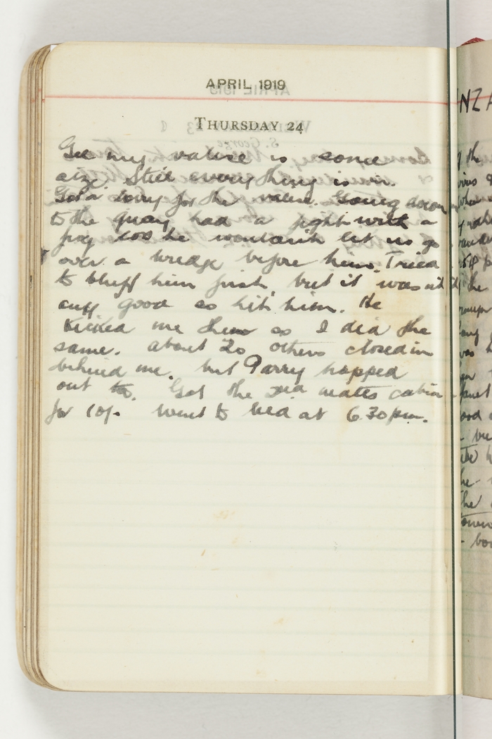 Gee my valise is some size. Still everything is in. Got a lorry for the valise. Going down to the quay had a fight with a frog cos he wouldn't let us go over a bridge before him. Tried to bluff him first but it wasn't any good so hit him. He kicked me then as I did the same. About 20 others closed in behind me but Parry hopped out too. Got the second mates cabin for 10/-. Went to be at 6.30 pm.