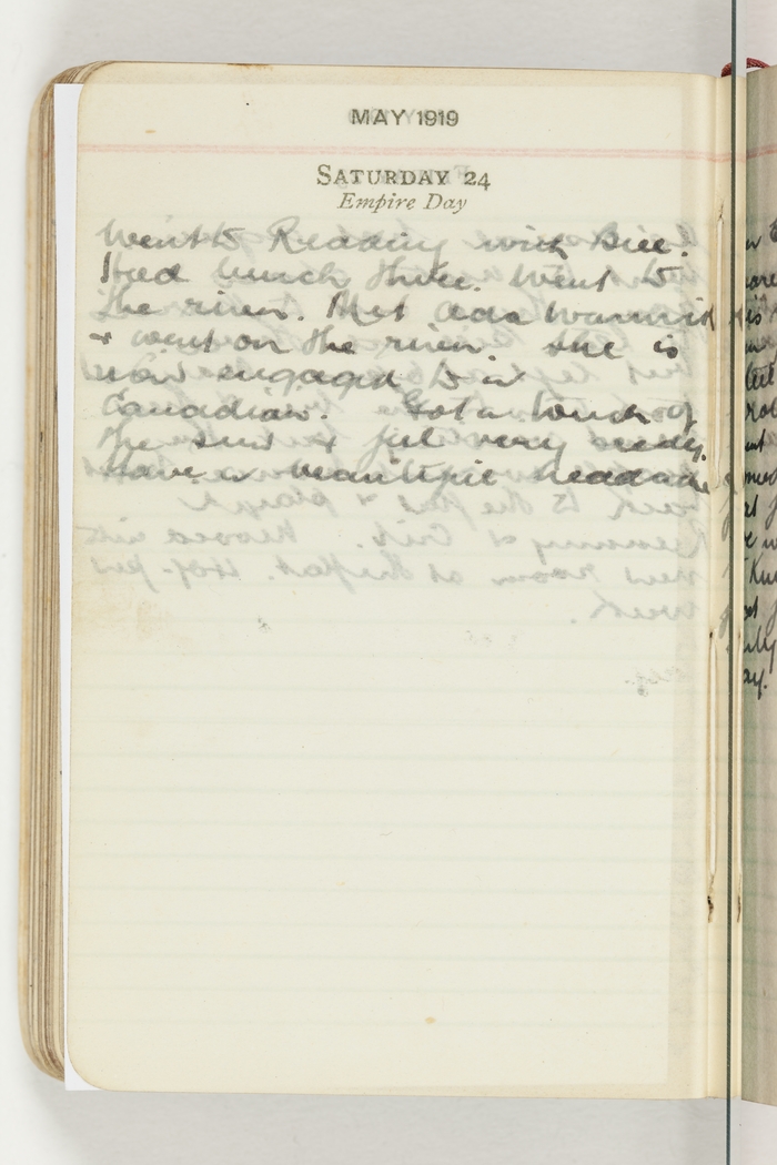 Went to Reading with Bill. Had lunch there. Went to the River. Met Ada Warwick & went on the river. She is now engaged to a Canadian. Got a touch of the sun & feel very seedy. Have a beautiful headache.