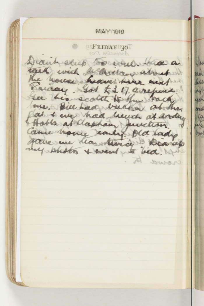 Didn't sleep too well. Had a talk with McMillan about the house. Leave here next Friday. Got £3.17.0 refund. Gee he's scotch to the back bone. Bill had brekker at the flat & we had lunch at Arding & Hobbs at Clapham Junction. Came home early. Old lady gave me tea twice. did up my photos & went to bed.